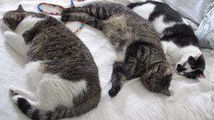 Boo Day 365 – Three Cats Sleeping In A Row On The Bed, Four Cats Eating On A Platter
