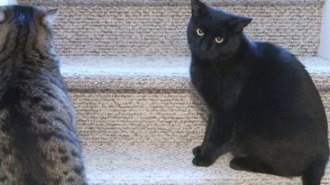 The cats played with the peacock feathers again. I saw a cat that looked like Stella’s relative. Boo and Stella sat in the cat towers together. Splash groomed...