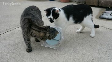 This is what happens when two cute little feral kittens see themselves in a mirror for the first time. They’re about 5 1/2 months old.