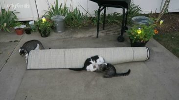 Feral kittens and mama cat love playing with a rolled up rug on the patio.