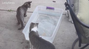 I filmed this through the window because I didn’t want to disturb them. The feral kittens were having fun playing with a rubber fishy bath toy in a tub of water...