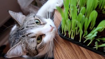 Boo Year 2 # 142 – Fresh Cat Grass, Hydrox And The First Crocus, Boo And Simba On The Bed