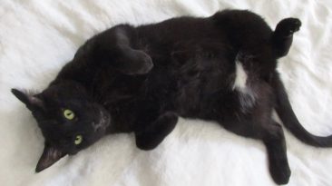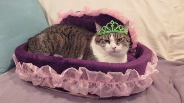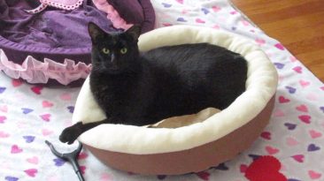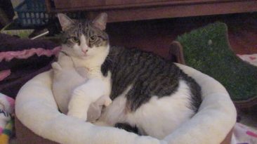 Boo has discovered that he really likes to lay in one of the round cat beds when there’s paper in the bottom of it. Stella likes to lay in that round cat bed also. Simba...