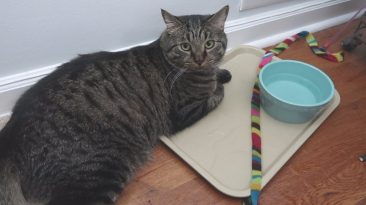 The cats understand the word breakfast. Stella has taken over Boo’s Turbo Scratcher. The cats made a mess out of one of their water bowls. We did a live stream...
