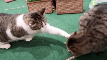 Boo is being served crunchies in his Catit Circuit because it’s good exercise for him to dig the crunchies out of it in order to eat them. Stella ate her cat grass...