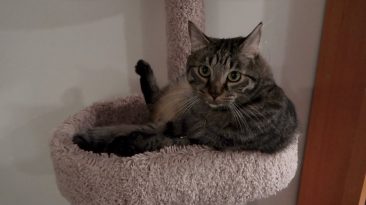Simba luxuriously relaxing in the comfy round bed on top of the cat tower in front of the windows with birds outside, birds on TV, and a human rubbing his tummy. How...