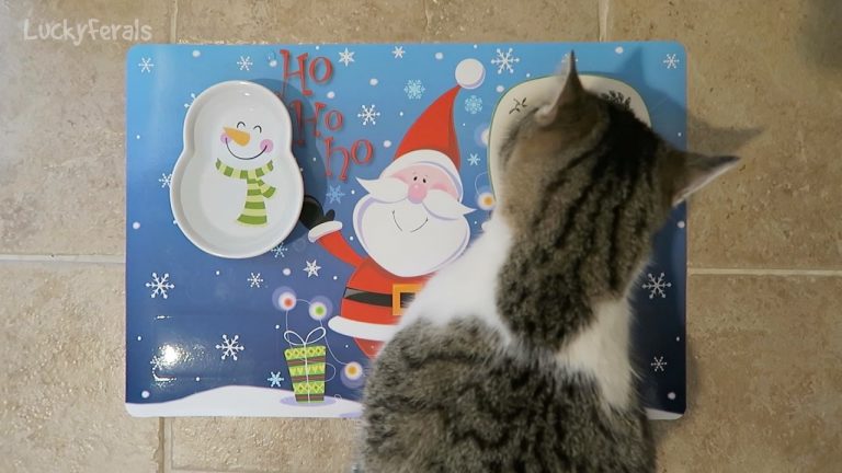 This is Stella’s Christmas Place Setting complete with Christmas Placemat, Snowman Water Bowl, and Spode Christmas Tree Dinnerware. She likes to eat like a lady. Just because you’re feral doesn’t mean you can’t be fabulous!
