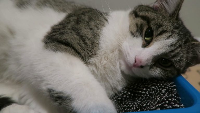 Stella likes to come inside to eat and sleep during the day. On this day, she saw me from across the yard and came running. I could barely turn the camera on before she was in the door. She likes to relax in her storage bin turned pet bed even though there’s a larger bed available.