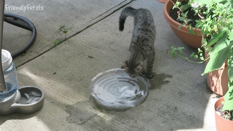 Cute feral kitten is captivated by ice cubes floating in a tray of water.
