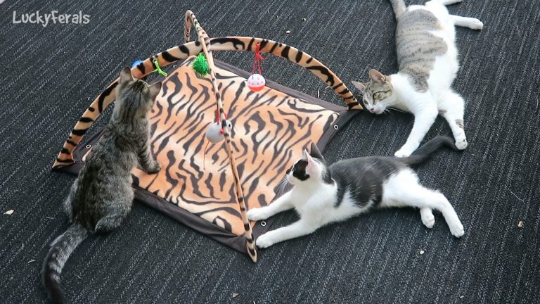 This is what happened when the feral cats experienced a cat play mat for the first time. Here is a link to the Cat Play Mat on Amazon –