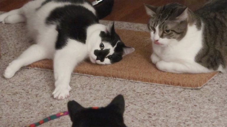 Stella loves to use the new scratching rug. Splash turned off the cat charmer video and wanted to read books instead. The cats tried a mung bean sprout for the first time. Hydrox was hanging out by the back door. He’s still eating very well. Boo chased Stella under the bed. They got into...