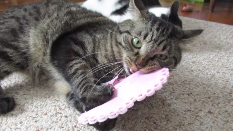 We made homemade DIY heart shaped cat toys for the cats for Valentine’s Day with supplies from The Dollar Tree.