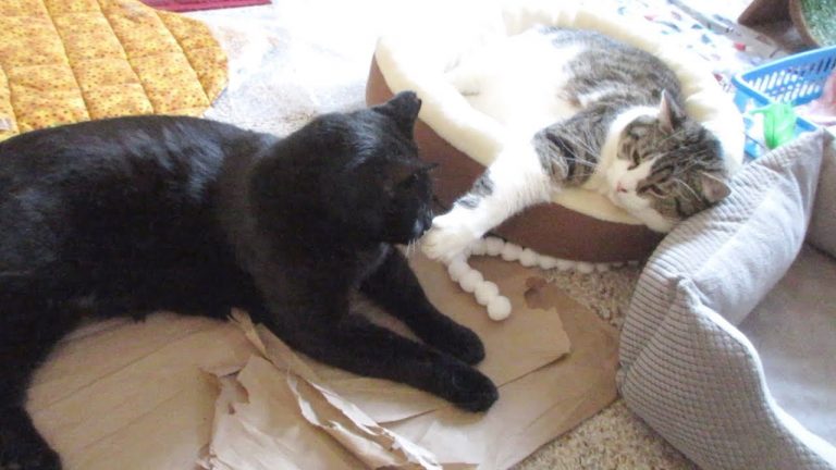 Boo loves sitting on packing paper. I made 18 days worth of homemade food for Hydrox for about $25 which came to about 69 cents per meal. It’s quicker and easier for me to freeze it in scoops on sheet pans than to use ice cube trays. Boo smelled Stella’s paw and she didn’t like that. She...