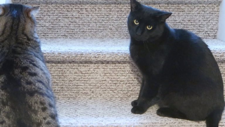 The cats played with the peacock feathers again. I saw a cat that looked like Stella’s relative. Boo and Stella sat in the cat towers together. Splash groomed Simba on top of the downstairs cat tower.