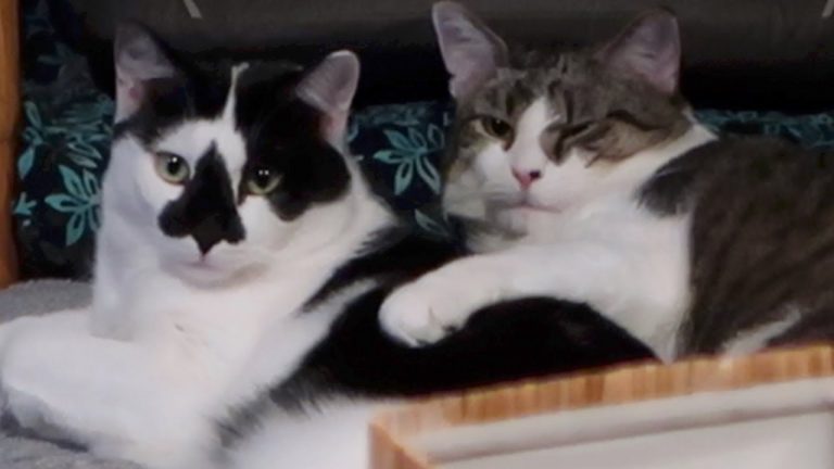 No one wants to eat near Boo. Hydrox was happy spending most of his day on the patio. Splash and Stella got comfortable relaxing together on the ottoman. This was Day 125 of training and socializing this feral cat (Boo).