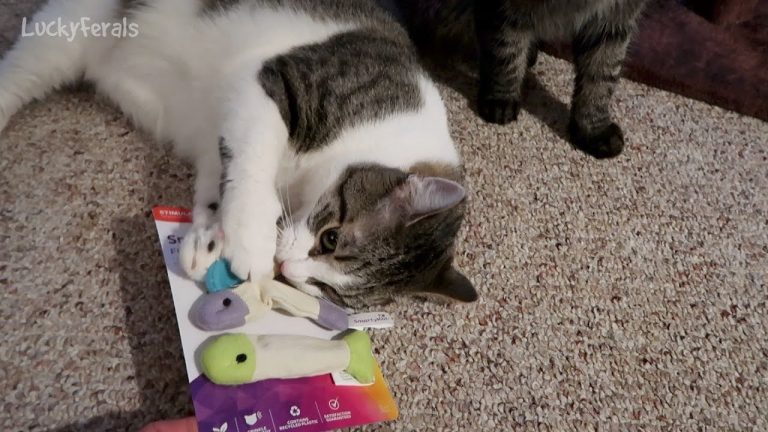 Training and socializing feral cats. Documenting the interactions with Boo on the second day after he showed up with missing fur on his head. He loves playing with toys. He had a little bit of catnip. And now that I’ve moved the cat lounge chair, he’s using it.