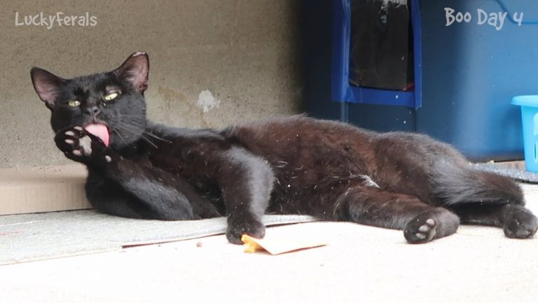 Feral cats always groom themselves after they eat. They groom themselves very thoroughly so that there is no trace or scent of food left that may attract predators. This is why many feral cats have neat fur and don’t look like a mess. This cat loves to groom himself. From Boo Day 4.